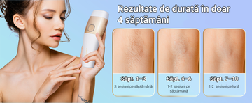 Rezultate vizibile în 4 săptămâni. Dispozitivul de epilare cu lumină intens pulsată (IPL) oferă rezultate vizibile în doar 4 săptămâni, datorită energiei puternice de 24J și lungimii de undă de 600–1200 nm, care pătrunde în profunzimea foliculului de păr pentru a întrerupe ciclul de creștere. Elimină părul eficient și în siguranță, oferind rezultate de lungă durată.