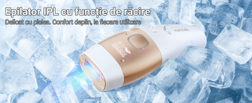 Atenționări: Nu este potrivit pentru piele tatuată, bronzată excesiv, zone cu răni sau pentru femei însărcinate. Butonul de răcire poate fi activat sau dezactivat oricând printr-o simplă apăsare.